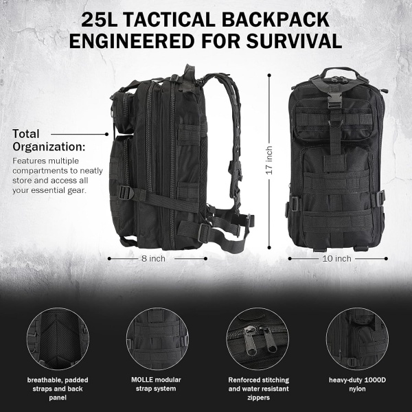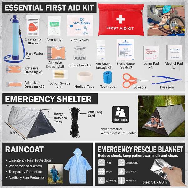 Zestaw pierwszej pomocy taktycznego plecaka survivalowego typu „wszystko w jednym” przeznaczony jest dla poszukiwaczy przygód na świeżym powietrzu, gotowości na wypadek sytuacji awaryjnych i reagowania na katastrofy. Zapakowany w trwały plecak w stylu wojskowym, łączy w sobie niezbędne narzędzia survivalowe, środki pierwszej pomocy i sprzęt ratunkowy w jednym kompletnym rozwiązaniu.