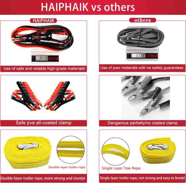 【Awaryjny zestaw samochodowy】: Najlepszy samochodowy zestaw awaryjny na Europę 2026 zawiera niezbędną skrzynkę narzędziową, wielofunkcyjną łopatę, zaawansowane kable rozruchowe (3,8 m), narzędzia do naprawy opon, linę trakcyjną, gwizdek ratunkowy, latarkę, rękawiczki i wiele innych. Składa się ze 124 elementów, co maksymalizuje Twoje bezpieczeństwo podczas awarii lub wypadków. 【Kable rozruchowe akumulatora】: Kable rozruchowe z certyfikatem UL zapewniają najwyższe bezpieczeństwo i niezawodność w porównaniu do produktów niecertyfikowanych. Cztery duże zaciski krokodylkowe zapewniają pewny chwyt, a izolowane gumowane szczęki. Wzmocniony korpus kabla wykonany jest z najwyższej jakości materiału PVC, zapewniającego odporność na pękanie przy zamarzaniu, zapobieganie pęknięciom i brak splątania! Wytrzymały kabel rozruchowy do akumulatora to niezawodny towarzysz podczas podróży i przygód na kempingu! 【Zestaw narzędzi do naprawy samochodu】: Ten poręczny zestaw narzędzi zawiera 16 niezbędnych narzędzi! Schludnie przechowuje niezbędne narzędzia do naprawy pojazdów ratowniczych: klucze, szczypce, młotek, tester napięcia, wkrętaki magnetyczne płaskie i krzyżakowe, klucze sześciokątne w pięciu rozmiarach... Każde narzędzie ma swoje dedykowane miejsce. Solidna plastikowa obudowa wytrzymuje nacisk. Kompaktowy i przenośny, przechowuj go w dowolnym miejscu! 【Zestaw bezpieczeństwa pojazdów drogowych】: Nadaje się do sedanów, SUV-ów, pojazdów terenowych, pojazdów kempingowych, kierowców ciężarówek, motocyklistów i innych typów pojazdów. Zawsze bądź przygotowany na sytuacje awaryjne! Ten kompaktowy samochodowy zestaw ratunkowy można łatwo przechowywać w pojeździe i zawiera niezbędne narzędzia zapewniające bezproblemową podróż. To idealny prezent-niespodzianka dla nowych właścicieli samochodów lub nieprzygotowanych kierowców. 【Przenośna składana łopata】 Łączy w sobie praktyczność, wszechstronność i bezpieczeństwo: ostrze łopaty, zęby piły, otwieracz do butelek, kilof, ściągacz do gwoździ, motyka, kompas. Długość w pełni rozciągnięta: 18 cali. Składa się kompaktowo, aby łatwo zmieścić się w torbie. W sytuacjach awaryjnych może przekopać się przez ziemię, aby uwolnić pojazd lub wybić szyby w celu ucieczki. Jeśli po zakupie napotkasz jakiekolwiek problemy z produktem, skontaktuj się z nami natychmiast. Zapewnimy pomoc! Zależy nam na poprawie jakości obsługi klienta!.
