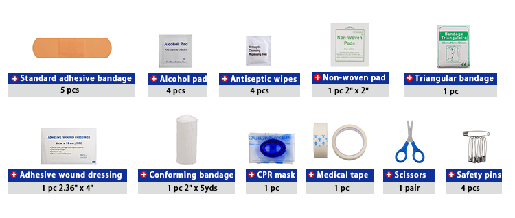 Obejmuje podstawowe artykuły pierwszej pomocy w przypadku drobnych obrażeń i codziennego użytku